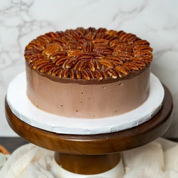 Luxurious layers of pecan chocolate cream with hidden coconut mousse & pecan chocolate truffles, finished with ganache & candied pecans
